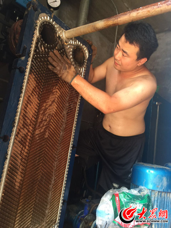 下午4時左右,大眾網(wǎng)記者來到位于丹陽路上的國稅局家屬院。家屬院角落處的供熱設(shè)備機(jī)房內(nèi)悶熱狹小,空氣流通不暢,大眾網(wǎng)記者剛進(jìn)去一小會就已經(jīng)汗流浹背。正在清洗換熱器的供暖管理員們有的光著膀子作業(yè),身上水光锃亮,有的脖子上掛著毛巾,但沒過幾分鐘剛在水管洗凈擰干的毛巾又已經(jīng)滿是汗水。