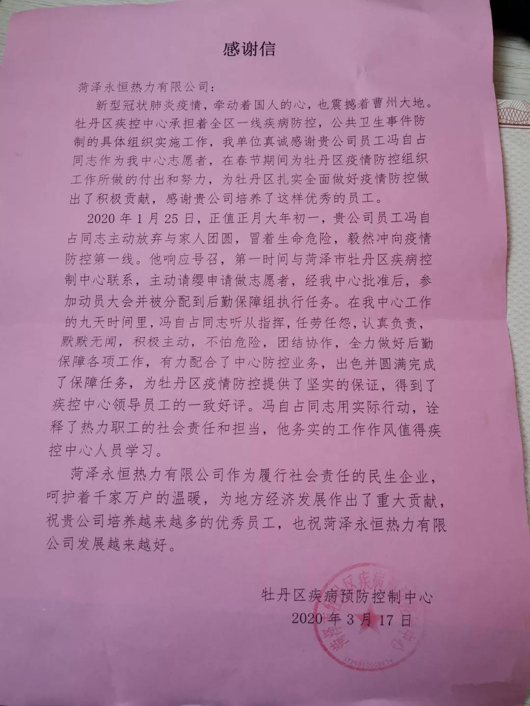 2020年初,疫情來襲,牽動著國人的心,也深深牽動永恒熱力運(yùn)營管理二部管理員馮自占的心,一夜輾轉(zhuǎn)反側(cè)后,他第一時間與菏澤市牡丹區(qū)疾病控制中心取得聯(lián)系,主動請纓申請做志愿者,經(jīng)批準(zhǔn),被分配到后勤保障組執(zhí)行任務(wù)。1月25日,正值正月大年初一,馮自占主動放棄與家人團(tuán)圓,冒著生命危險,義無反顧沖向疫情防控第一線。“我不是醫(yī)生,不能再次奔赴前線,救危難于生死,那我就多做些力所能及的事情”,事實上馮自占也是這么做的,他出色并圓滿完成了保障任務(wù),被牡丹區(qū)疾病預(yù)防控制中心授予了“新型冠狀病毒肺炎防控優(yōu)秀志愿者”稱號。