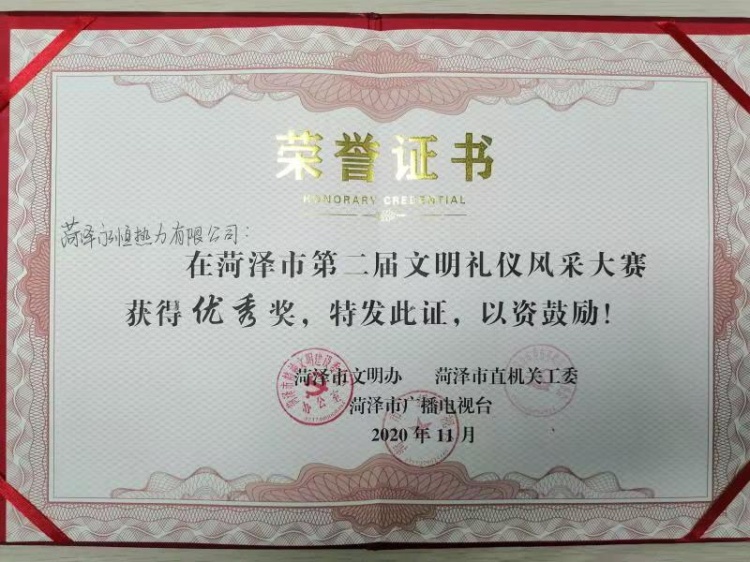 11月26日,由市文明辦、市直機關(guān)工委、市廣播電視臺舉辦的“菏澤市第二屆文明禮儀風采大賽頒獎典禮”在菏澤市廣播電視臺演播大廳舉行。菏澤永恒熱力有限公司榮獲菏澤市第二屆文明禮儀風采大賽優(yōu)秀組織獎。