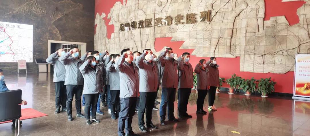 在菏澤冀魯豫邊區(qū)革命紀(jì)念館序廳內(nèi),由支部書記肖培飛同志領(lǐng)誓,全體黨員整齊列隊(duì),鄭重舉起右手,集體重溫入黨誓詞。