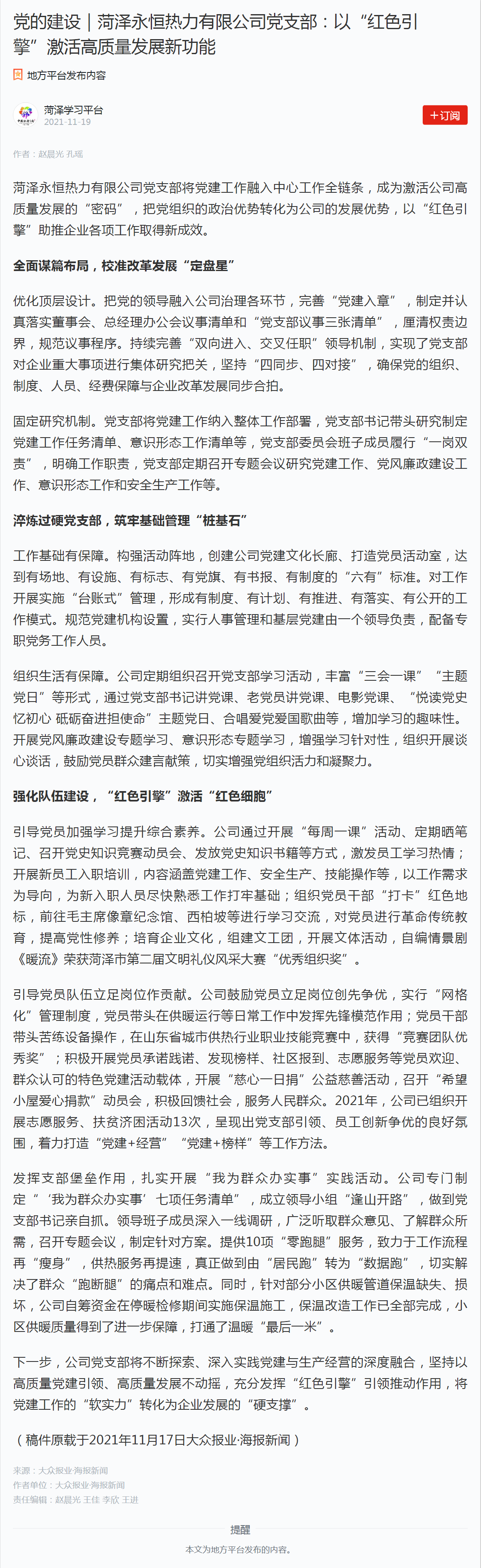 黨的建設(shè)|菏澤永恒熱力有限公司黨支部:以“紅色引擎”激活高質(zhì)量發(fā)展新功能