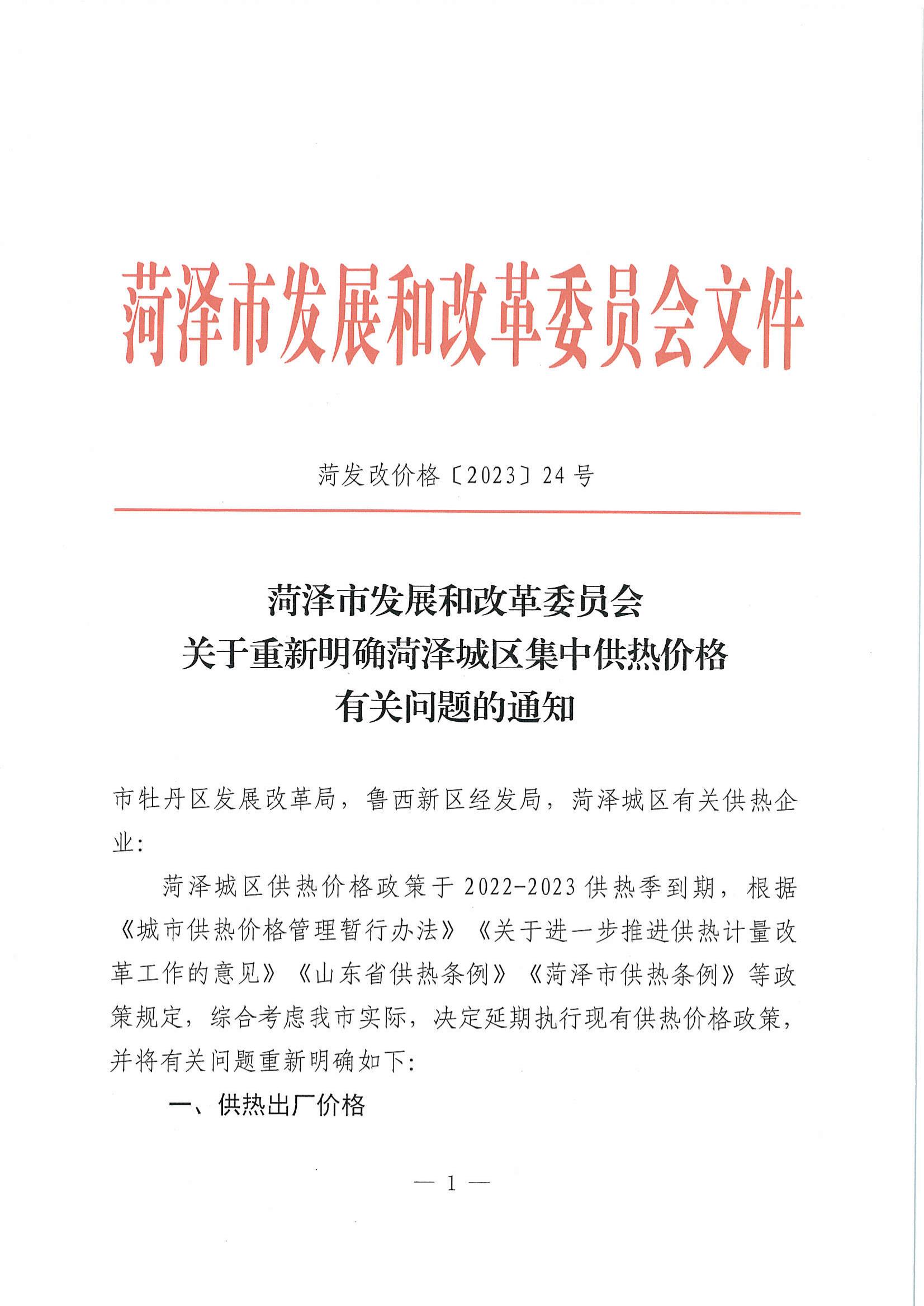 菏澤永恒熱力有限公司熱力銷售價(jià)格及收費(fèi)依據(jù)