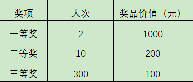 4.三等獎(jiǎng),人數(shù):400名,獎(jiǎng)勵(lì):價(jià)值100元的獎(jiǎng)品;