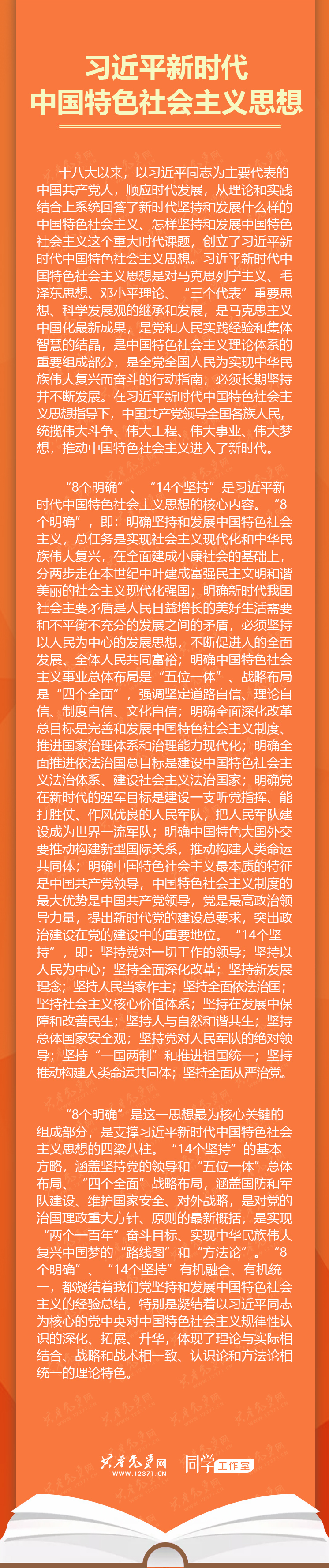 “8個明確”、“14個堅持”是習(xí)近平新時代中國特色社會主義思想的核心內(nèi)容。“8個明確”,即:明確堅持和發(fā)展中國特色社會主義,總?cè)蝿?wù)是實現(xiàn)社會主義現(xiàn)代化和中華民族偉大復(fù)興,在全面建成小康社會的基礎(chǔ)上,分兩步走在本世紀(jì)中葉建成富強(qiáng)民主文明和諧美麗的社會主義現(xiàn)代化強(qiáng)國;明確新時代我國社會主要矛盾是人民日益增長的美好生活需要和不平衡不充分的發(fā)展之間的矛盾,必須堅持以人民為中心的發(fā)展思想,不斷促進(jìn)人的全面發(fā)展、全體人民共同富裕;明確中國特色社會主義事業(yè)總體布局是“五位一體”、戰(zhàn)略布局是“四個全面”,強(qiáng)調(diào)堅定道路自信、理論自信、制度自信、文化自信;明確全面深化改革總目標(biāo)是完善和發(fā)展中國特色社會主義制度、推進(jìn)國家治理體系和治理能力現(xiàn)代化;明確全面推進(jìn)依法治國總目標(biāo)是建設(shè)中國特色社會主義法治體系、建設(shè)社會主義法治國家;明確黨在新時代的強(qiáng)軍目標(biāo)是建設(shè)一支聽黨指揮、能打勝仗、作風(fēng)優(yōu)良的人民軍隊,把人民軍隊建設(shè)成為世界一流軍隊;明確中國特色大國外交要推動構(gòu)建新型國際關(guān)系,推動構(gòu)建人類命運(yùn)共同體;明確中國特色社會主義最本質(zhì)的特征是中國共產(chǎn)黨領(lǐng)導(dǎo),中國特色社會主義制度的最大優(yōu)勢是中國共產(chǎn)黨領(lǐng)導(dǎo),黨是最高政治領(lǐng)導(dǎo)力量,提出新時代黨的建設(shè)總要求,突出政治建設(shè)在黨的建設(shè)中的重要地位。“14個堅持”,即:堅持黨對一切工作的領(lǐng)導(dǎo);堅持以人民為中心;堅持全面深化改革;堅持新發(fā)展理念;堅持人民當(dāng)家作主;堅持全面依法治國;堅持社會主義核心價值體系;堅持在發(fā)展中保障和改善民生;堅持人與自然和諧共生;堅持總體國家安全觀;堅持黨對人民軍隊的絕對領(lǐng)導(dǎo);堅持“一國兩制”和推進(jìn)祖國統(tǒng)一;堅持推動構(gòu)建人類命運(yùn)共同體;堅持全面從嚴(yán)治黨。